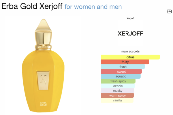 Erba Gold by Xerjoff is a fragrance for women and men. Erba Gold was launched in 2016. Top notes are Brazilian Orange, Sicilian Lemon, Calabrian bergamot and Ginger; middle notes are Melon, Pear, Green Apple, Cinnamon, Guatemalan Cardamom and Cloves; base notes are White Musk, Madagascar Vanilla, Amber and Woody Notes.