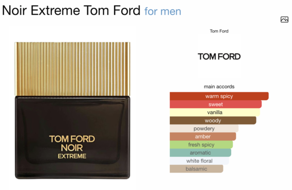Noir Extreme by Tom Ford is a Oriental Woody fragrance for men. Noir Extreme was launched in 2015. The nose behind this fragrance is Sonia Constant. Top notes are Cardamom, Nutmeg, Saffron, Mandarin Orange and Neroli; middle notes are Kulfi, Rose, Mastic or Lentisque, Jasmine and Orange Blossom; base notes are Vanilla, Amber, Woody Notes and Sandalwood.